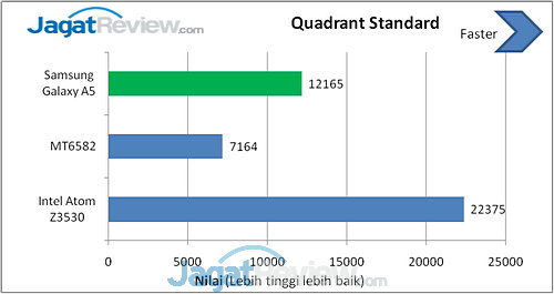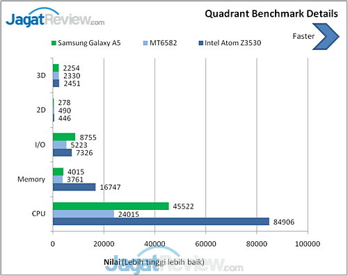 Quadrant adalah benchmark untuk CPU, I/O, dan grafis 3D. Versi yang kami gunakan adalah Standard Edition yang bisa diunduh secara gratis. Semakin tinggi nilai yang dihasilkan benchmark ini, semakin baik.
