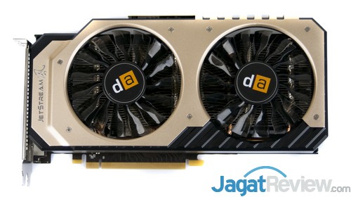 GeForce GTX 970 dari Digital Alliance ini mengandalkan sistem pendingin dengan julukan JetStream dengan paduan warna perunggu dan hitam pada heatsink cover. Lucunya, meskipun terlihat memiliki desain dual slot cooler, sistem pendingin tersebut sebenarnya memiliki ketebalan 2,5 slot. Tentu saja hal tersebut menandakan konfigurasi multi-GPU membutuhkan motherboard dengan jarak slot ekspansi sangat lebar, setidaknya tiga slot.