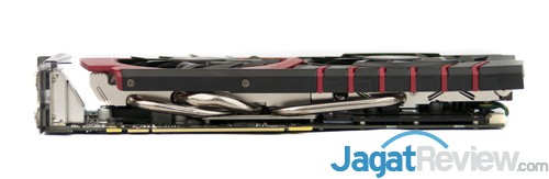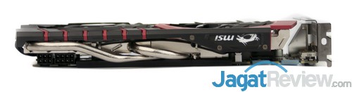 MSI GTX 970 Gaming tidak dilengkapi pelat logam pada sisi belakang melainkan pada sisi depan graphics card.
