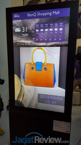 Salah satu produk BenQ yang cukup menarik perhatian adalah Double Sided Signage. Display ini berukuran 55 inci dengan orientasi frame type dan stand type. Desainnya sangat ramping dan cocok untuk ditempatkan di mall atau pertokoan. Dengan resolusi Full HD, apapun yang ditayangkan dengan display ini akan mampu menarik mata konsumen.