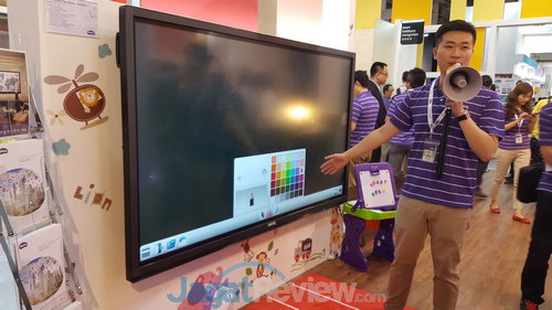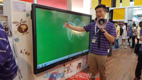 Selain itu, ada pula Interactive Flat Panel dengan ukuran 84 inci! Display ini cocok digunakan untuk edukasi misalnya di sekolah sebagai alternatif dari papan tulis. Dengan multi touch hingga 10 titik, resolusi 4K, anti glare glass, dan sistem operasi Android memungkinkan user melakukan banyak hal.