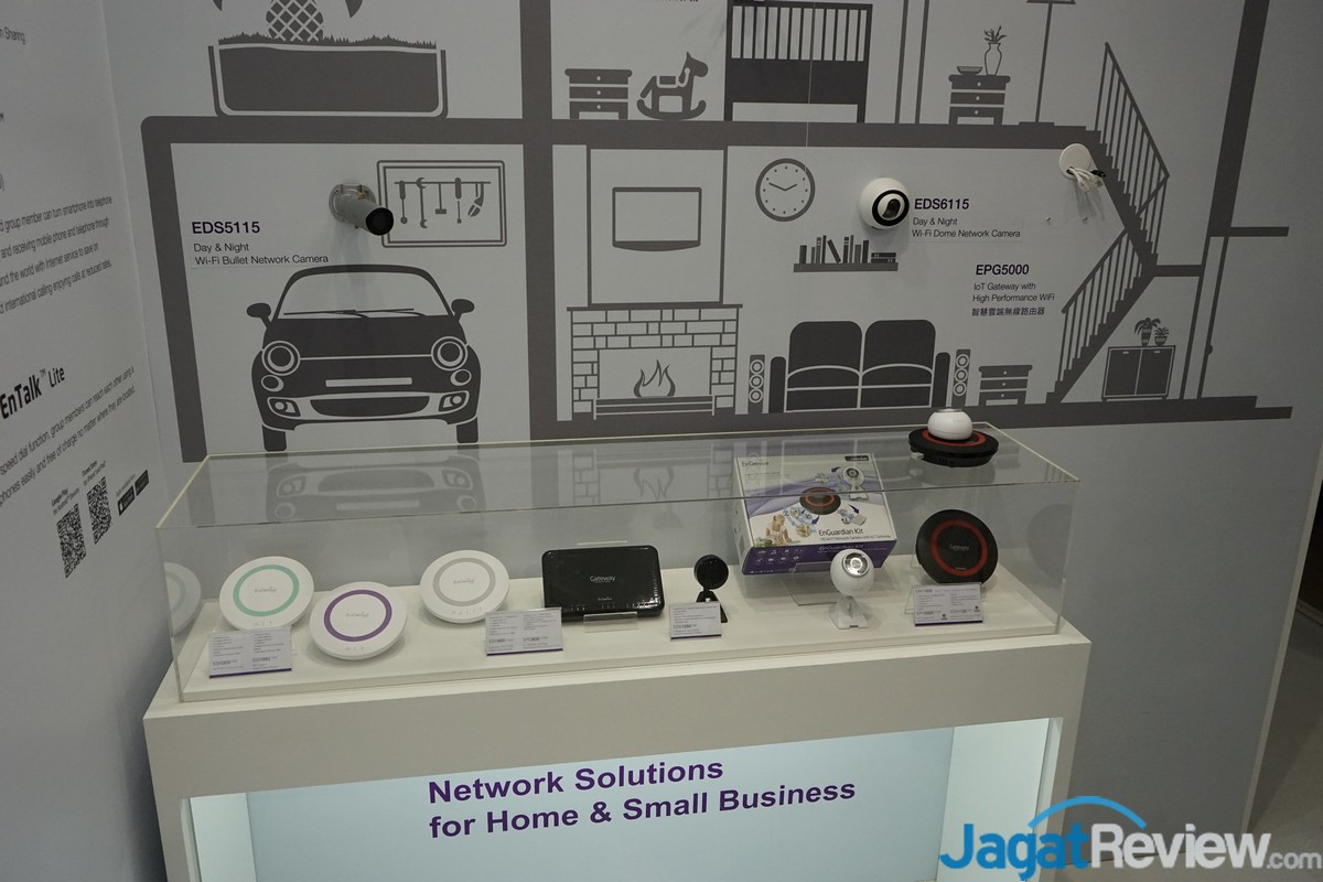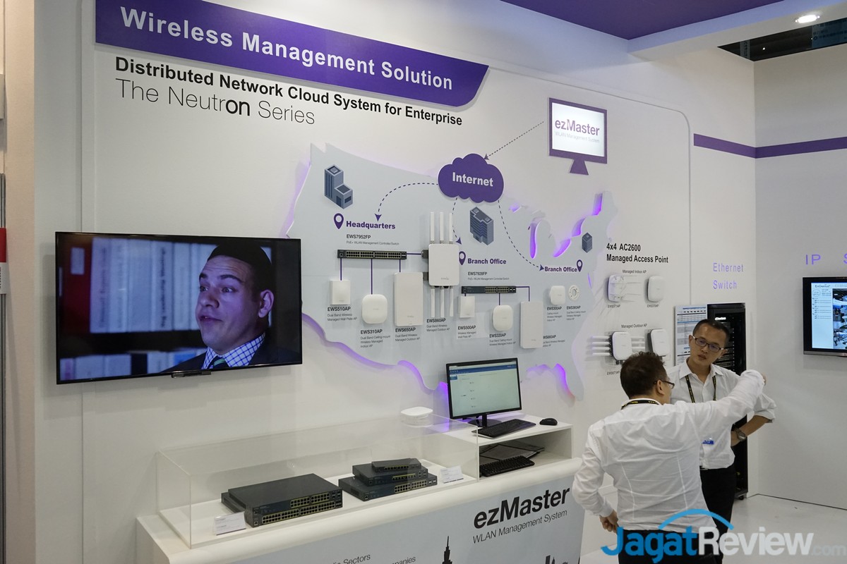 Di bagian depan booth, EnGenius memamerkan solusi lengkap distributed network yang telah dilengkapi dengan dukungan cloud. Solusi ini akan berguna untuk perusahaan yang ingin membangun jaringan lokal skala besar, yang meliputi tidak hanya satu area lokal saja, tetapi hingga ke beberapa area lokal, misalnya untuk beberapa kantor perwakilan di suatu negara. Sistem ini memiliki kontrol terpusat sehingga tetap mudah diatur walaupun pada prakteknya mencakup area yang sangat luas.