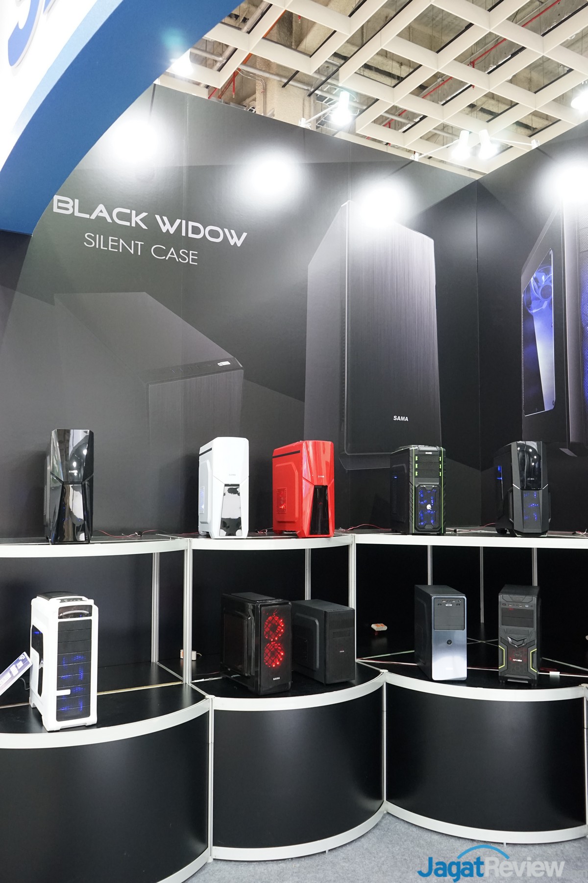 Setelah berbincang-bincang dengan pihak SAMA, kami pun langsung melihat-lihat lebih detail apa yang di dalam booth ini. Pada bagian depan booth ini, kami melihat jajaran casing SAMA dari berbagai tipe yang dipajang pada bagian booth ini.