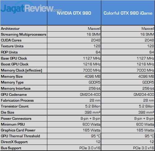 GTX 980 dari Colorful ini secara out of the box memiliki clock yang sama dengan versi reference, yakni 1127 MHz pada base clock, dan 1216 MHz pada boost clock.