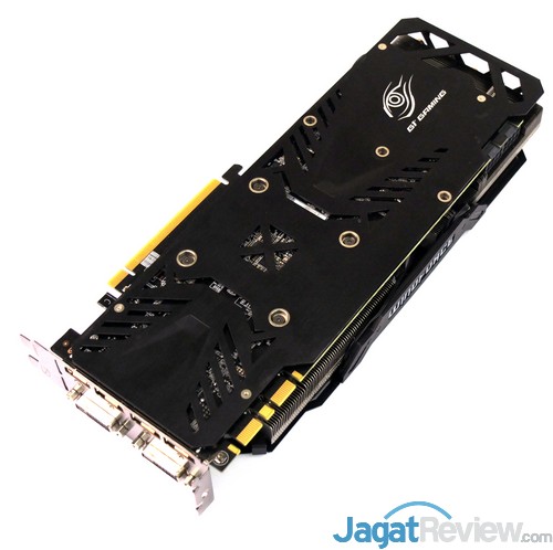 Gigabyte juga memberikan backplate di GTX 980 Ti G1 Gaming SOC ini. Selain untuk mempercantik penampilan, backplate juga berfungsi agar PCB graphics card tersebut tidak bengkok. Hal itu dibutuhkan mengingat heatsink dari graphics card ini memiliki bobot yang cukup berat.