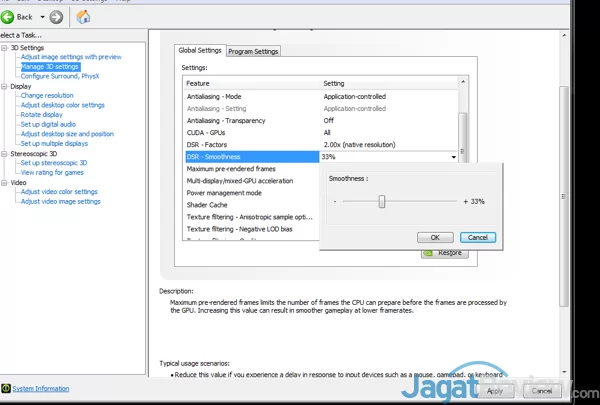 NVIDIA juga memberikan fitur tambahan, yakni DSR smoothness, dimana pengguna dapat secara langsung mengatur tingkat smoothness dari gambar yang dihasilkan saat menjalankan DSR. DSR ini juga mendukung resolusi hingga 2560 x 1440 di monitor dengan resolusi rendah, seperti 1360 x 768 dan 1600 x 900.