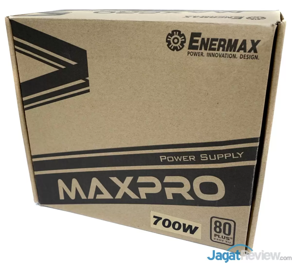 Tampilan luar kemasan Enermax MAXPRO tampil sangat sederhana. Pada bagian kemasan ini terlihat label 80+ standar yang menandakan bahwa power-supply ini memiliki tingkat efisiensi daya yang mencapai 80% atau diatasnya.
