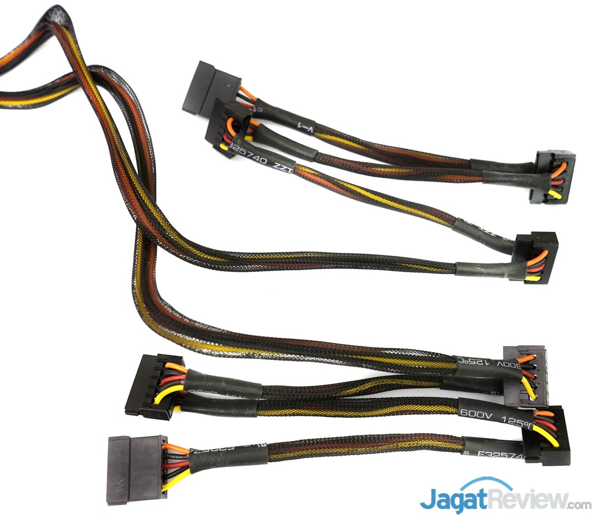 PSU dari Enermax MAXPRO 700 watt ini dilengkapi dengan 2 kabel untuk power SATA yang masing-masing memiliki 4 konektor power SATA.