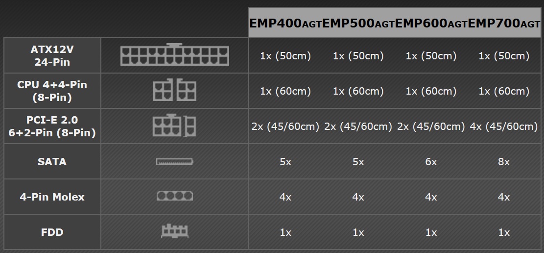 PSU Enermax MAXPRO 700 watt menggunakan kabel power ATX-24pin dan hanya menyediakan 1 unit kabel power CPU 4+4 pin.