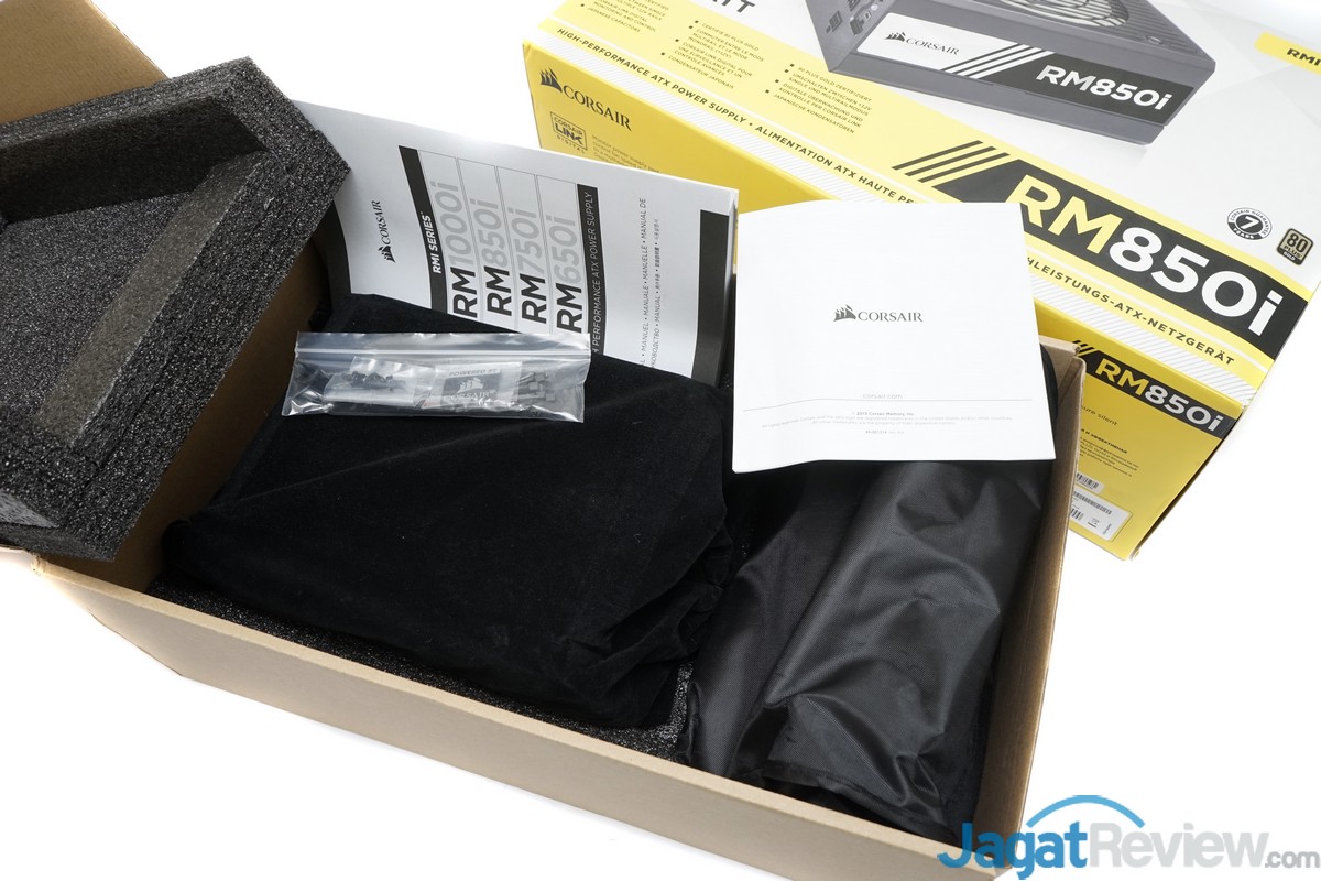 Sama seperti produk PSU premium Corsair lainnya, paket penjualan PSU Corsair RM850i ini dilengkapi dengan aksesoris dan kelengkapan lainnya yang terbilang cukup lengkap. Paket penjualan PSU Corsair ini terdiri dari satu unit PSU, buku petunjuk manual, kartu garansi, sticker, baut, kabel AC, kabel modular, kantong PSU, kantong kabel modular, pengikat kabel dan kabel konektor USB untuk fitur Corsair Link. Kabel Corsair Link ini lah yang mejadi pembeda utama paket penjualan dari RMi dengan RM Series.