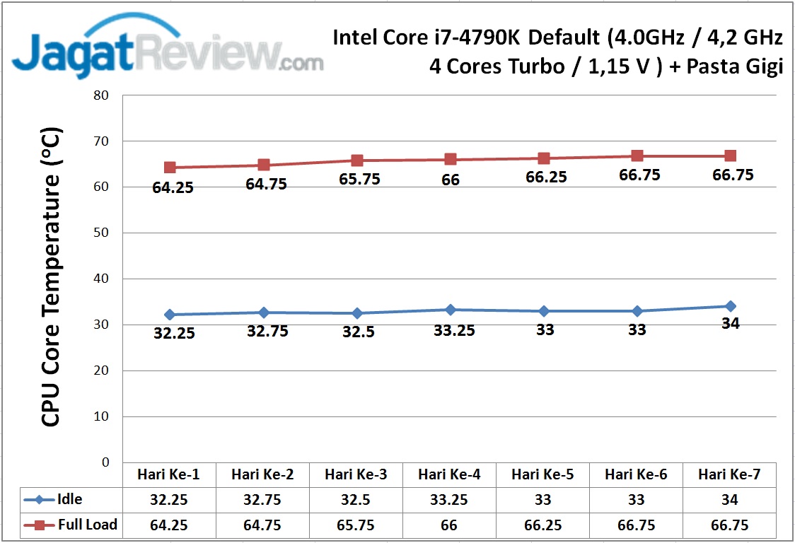 Suhu yang tercantum dalam grafik merupakan suhu rata-rata dari seluruh core yang ada pada prosesor Intel Core i7 4790K yang digunakan dalam pengujian ini. Berikut data suhu panas prosesor Intel Core i7 4790K pada saat diberi beban kerja penuh dan pada saat idle, baik ketika heatsink dipasang tanpa thermal paste, dengan pasta gigi, maupun dengan thermal paste.