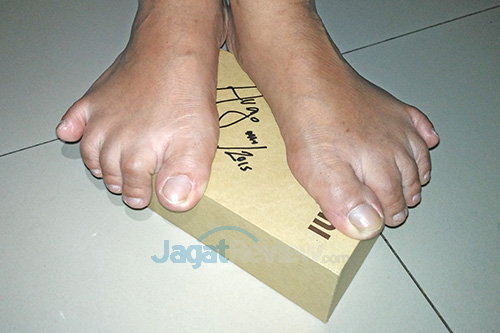 Dan seperti biasa, pengujian pertama kami untuk perangkat Xiaomi adalah kotak paket penjualannya. Karena Xiaomi berjanji bahwa mereka akan memberikan paket penjualan yang kuat sehingga isi dari paket tersebut aman dari tekanan tertentu. Kami pun meminta model yang menginjak kotak ini agar tidak menginjak tanda tangan Hugo. Tentunya, supaya tidak kotor 🙂