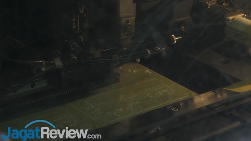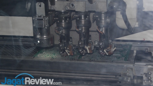 Beberapa IC dan controller juga dipasang di sisi sebaliknya dari board.Board yang baru saja keluar dari mesin pemasangan komponen otomatis.Tumpukan board yang siap dioper ke tempat pemrosesan selanjutnya.Untuk jenis board lain, terdapat juga proses persiapan yang berbeda dengan mesin yang berbeda. Di mesin ini, beberapa bagian board dilapisi dengan lem untuk menahan beberapa komponen kecil yang akan dipasang,Setelah melewati proses pengeleman, mesin otomatis membawa board ke mesin lain tempat di mana komponen-komponen kecil dipasang.Board UPS dengan beberapa komponen kecil terpasang.Pekerja memeriksa apakah pemasangan komponen sudah benar.Selain pemeriksaan manual, terdapat juga mesin yang mengambil gambar bagian-bagian board dan mencocokkannya dengan board standar. Posisi dan penempatan dari komponen akan dicocokkan secara otomatis. Bila terjadi kesalahan, mesin akan melaporkannya.Proses berikutnya adalah memasang berbagai komponen berukuran besar ke board. Proses ini dilakukan oleh para pekerja dengan sistem ban berjalan secara estafet.Tidak semua pekerja bertugas memasang komponen ke board. Ada juga yang bertugas untuk menyiapkan terlebih dahulu beberapa komponen yang akan dipasang oleh rekannya.Satu per satu komponen dipasang. Di sini, para pekerja tengah membaut heatsink ke board.Berbagai komponen terus ditambahkan ke board sebelum board masuk ke dalam mesin solder otomatis.Sesaat sebelum masuk ke pintu mesin solder otomatis, pekerja memeriksa apakah semua komponen telah terpasang di tempatnya dengan sempurna.Board yang baru saja melalui proses solder.Pekerja kembali menggunakan mesin untuk memeriksa board yang baru keluar dari mesin solder. Di sini, semua jalur solder diperiksa, dan semua kesalahan yang ada dicatat sesuai dengan serial number sementara di board.Hasil dari pemeriksaan menggunakan mesin di gambar sebelumnya menjadi acuan bagi para pekerja di bagian berikutnya untuk memperbaiki jalur-jalur yang kurang di board.Setelah semua proses pembenahan selesai, board diuji oleh mesin khusus untuk memastikan semua komponen telah bekerja dengan benar. Bila terdapat board yang gagal melewati tes, pekerja akan memisahkanya dari tumpukan board yang berfungsi normal. Board-board gagal ini tidak akan digunakan lagi dalam proses produksi.