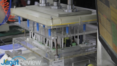 Controller untuk UPS terlebih dahulu disiapkan dengan memasukkan firmware ke dalamnya.Board utama UPS juga disiapkan dengan memasang beberapa komponen, seperti kapasitor berukuran kecil dan resistor. Di sini, pemasangan dilakukan secara otomatis menggunakan mesin.