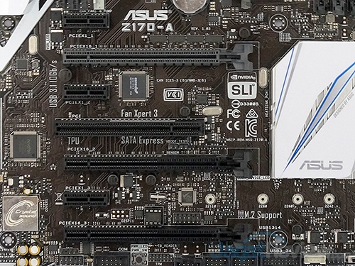Heatsink yang digunakan di bagian VRM mothrerboard ini memang tak memiliki ukuran yang cukup besar serta Anda tak akan menemukan heatpipe untuk menyebarkan panas. Selain itu, heatsink ini hanya di tanamkan dengan menggunakan push-pin, kami rasa sebuah baut dengan pegas akan lebih baik. Memang untuk sebuah motherboard kelas mid-range, Z170-A memiliki VRM yang cukup “melimpah” mungkin hal ini dilakukan ASUS karena Intel kembali memindahkan regulasi voltase ke motherboard, berbeda dari Haswell dan Broadwell yang regulasi voltasenya dilakukan oleh integrated voltage regulator. Sedangkan di atas chipset Intel Z170 pada motherboard ini terdapat heatsink yang cukup besar untuk membantu membuang panas yang dihasilkan chipset Intel Z170.