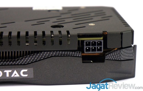 VGA card Zotac Zotac GTX 950 AMP! Edition ini menggunakan konfigurasi konektor daya 6 pin mirip dengan versi reference.