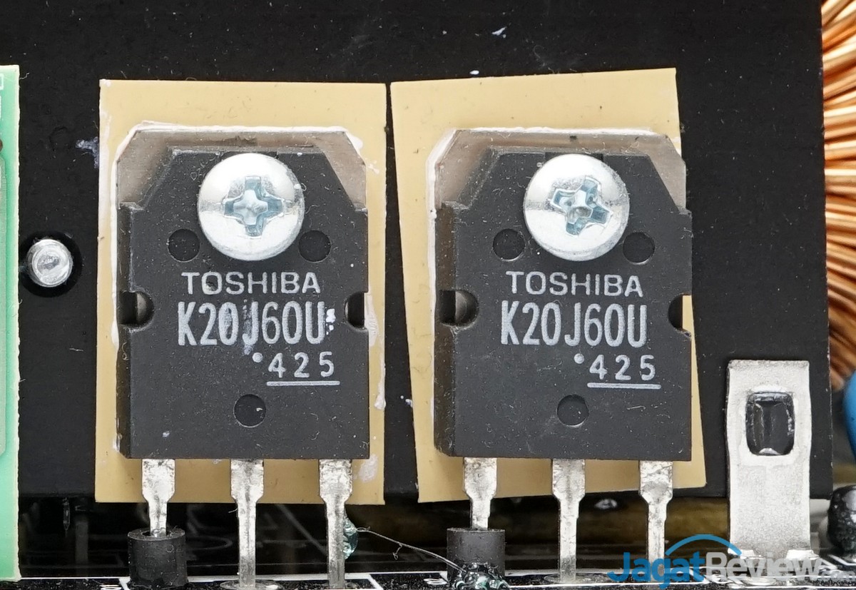 PSU ini dilengkapi dengan MOSFET buatan perusahaan asal Jepang, Toshiba, yang mampu menangani arus listrik sebesar 20 Ampere, yang mampu berkerja pada suhu kerja yang tinggi.