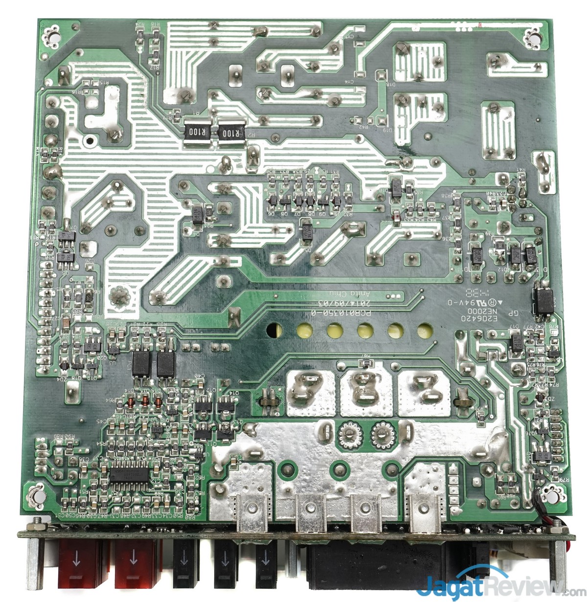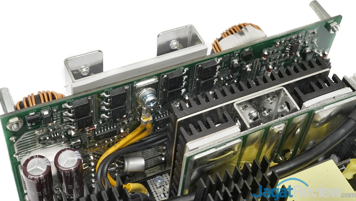 Komponen MOSFET dan bridge dioda PSU ini dilengkapi dengan heatsink pendingin berukuran besar.