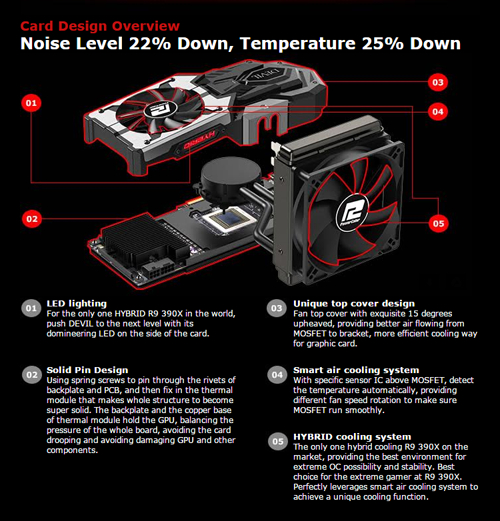 PowerColor Devil R9 390X 8 GB mengimplementasikan hybrid cooling system untuk performa pendinginan terbaik bagi graphics card mereka.Hybrid cooling systemtersebut menggabungkan dua metode pendinginan dengan menggunakan cairan dan udara. Aliran cairan digunakan untuk menundukkan panas chip GPU sementara hembusan udara membantu mendinginkan seluruh komponen lain di permukaan PCB.
