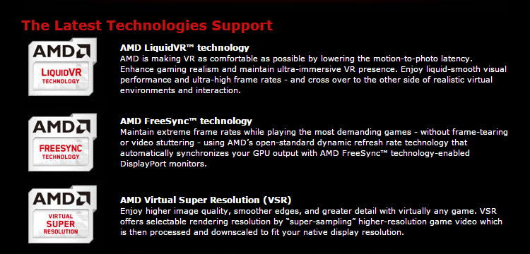 PowerColor Devil R9 390X 8 GB tentu saja tidak luput untuk menawarkan teknologi grafis tercanggih dari AMD seperti LiquidVR, FreeSync, dan Virtual Super Resolution. Teknologi AMD LiquidVR siap menawarkan pengalaman terbaik di dunia virtual reality. Sementara AMD FreeSync memungkinkan gamer mendapatkan pengalaman bermain game terbaik bebas dari gejala tearing dan stuttering. Sedangkan AMD Virtual Super Resolution memungkinkan gamer mendapatkan kualitas tampilan visual pada game lebih tinggi berkat penggunaan resolusi gambar “super” besar.