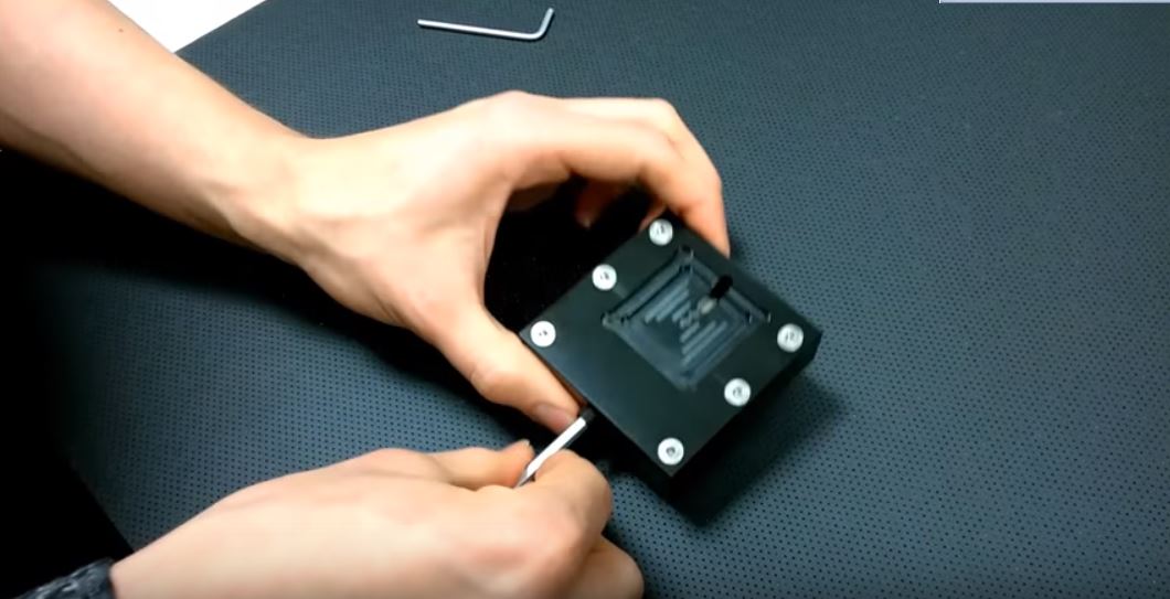 Setelah dua bagian Clamp atau penjepit dikencangkan dengan 6 baut pengencang, pengguna hanya perlu memutar kunci khusus yang berada di belakang menggunakan kunci L. Setelah beberapa kali putaran, Cover lid prosesor selanjutnya akan terlepas otomatis dan proses Delidding sudah selesai. Semua proses ini hanya memakan waktu kurang dari 5 menit. Mungkin bisa Anda bayangkan proses waktu Delidding manual menggunakan pisau/blade, terlihat sangat jauh berbeda.