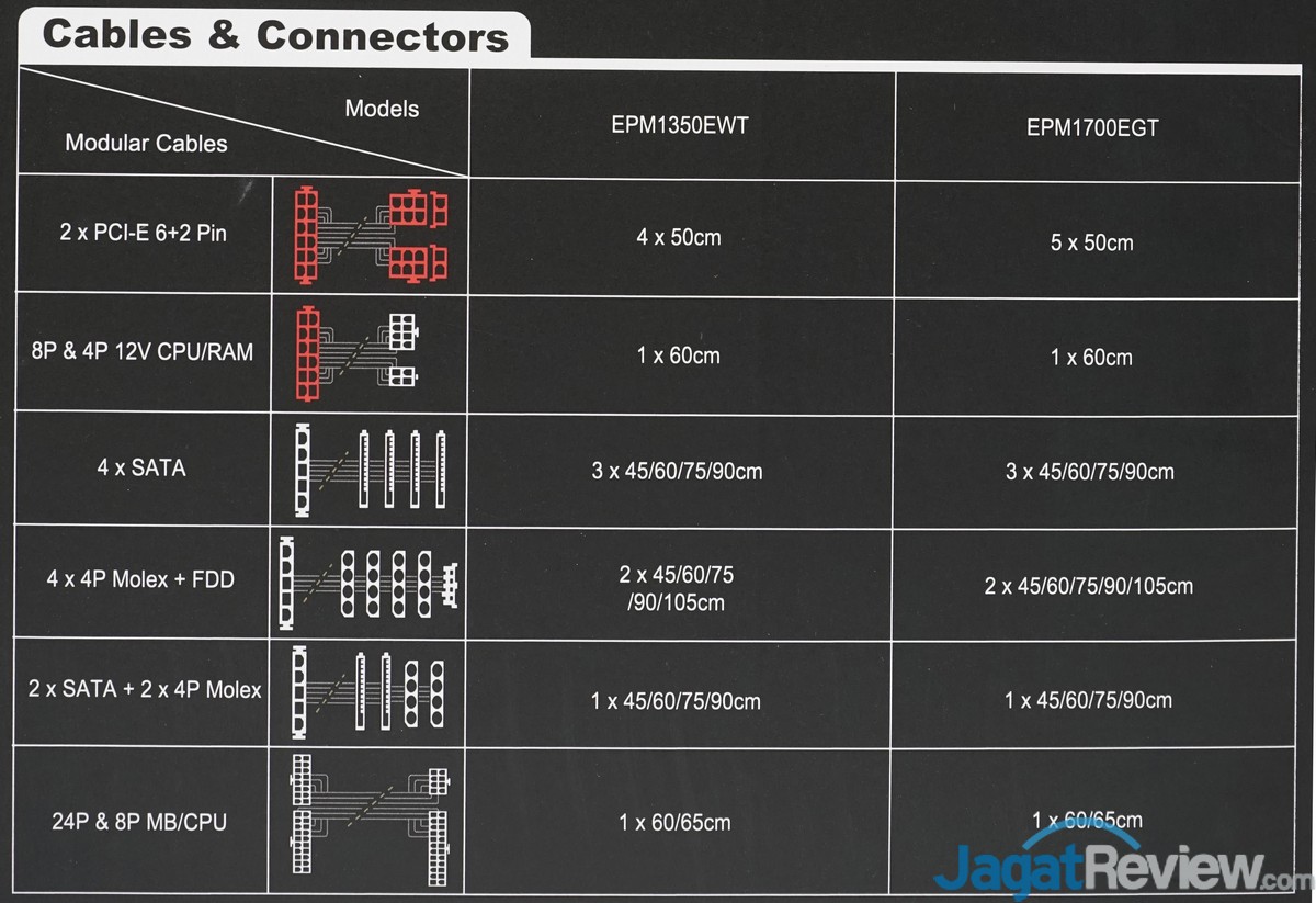 Enermax Platimax 1700 dilengkapi dengan sebuah set kabel modular utama yang dilengkapi dengan konektor power ATX 20+4 pin dan CPU Power 4+4 pin sekaligus.