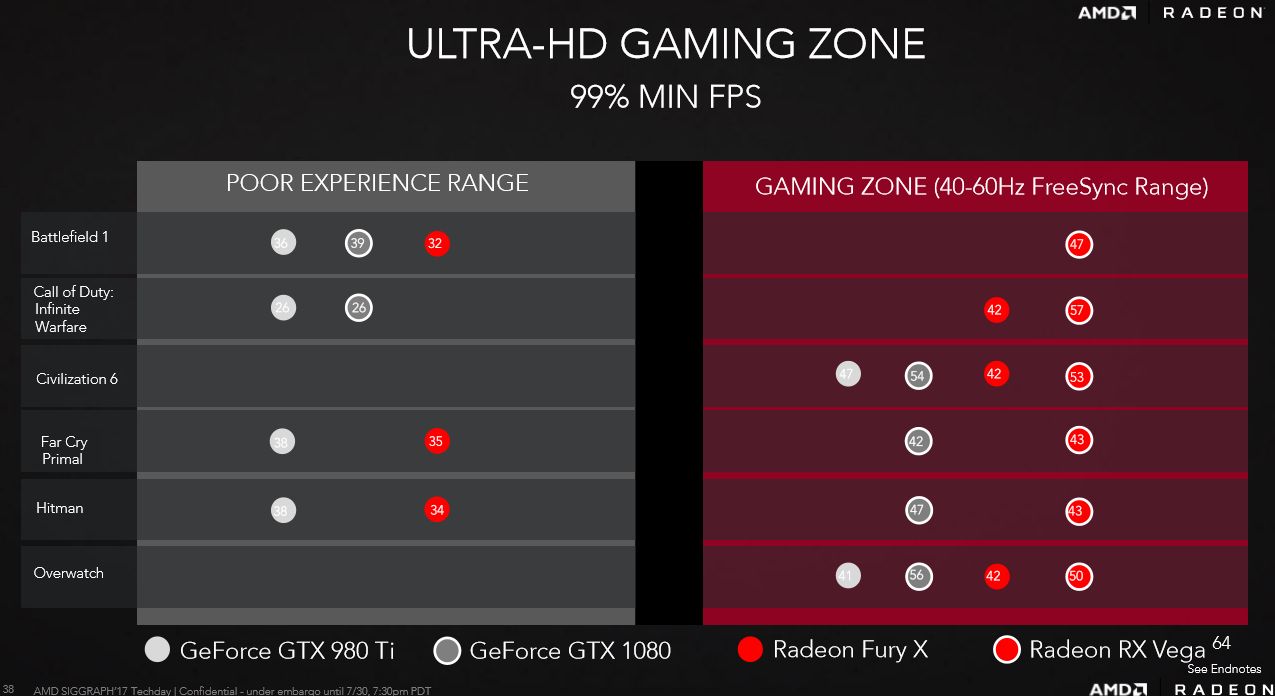 AMD tidak banyak menunjukkan benchmark sintetis pada presentasi RX Vega. Namun salah satu poin yang mereka bicarakan di sini adalah pentingnya menjaga framerate minimum, atau lebih tepatnya 99th percentile FPS (ini adalah satu metrik untuk mengukur framerate terburuk pada sebuah game). AMD mengklaim bahwa arsitektur VEGA mereka dengan berbagai optimalisasi game dan juga penggunaan HBM2 akan membuat perfoma RX VEGA sangat kompetitif di bagian 99th percentile, terutama saat disandingkan dengan skenario monitor Freesync pada 1440p Ultra-Wide (3440×1440), dan juga 4K Ultra HD.