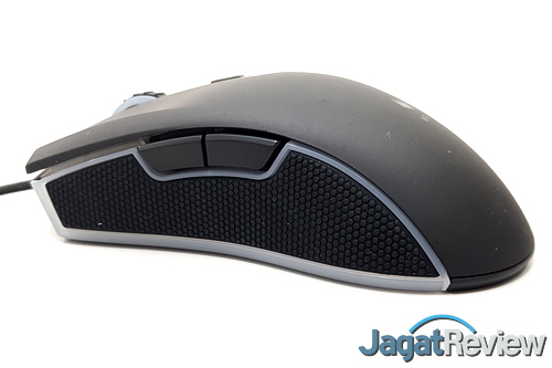 Sementara untuk dua tombol yang terletak di sisi samping kiri, kami merasa keduanya tidak menawarkan sensasi yang pas untuk mouse ini, cukup berbeda dengan tombol-tombol utama mouse. Kedua tombol di sisi samping kiri ini memang cukup nyaman ditekan, tidak keras, tetapi keduanya terasa agak kurang kokoh, membuat tombol terasa terdorong terlalu jauh ke dalam saat ditekan, terutama untuk tombol yang ada di dekat pengguna. Fungsi keduanya memang cukup membantu, baik untuk navigasi maupun di dalam game, bila memang digunakan pengguna, tetapi sensasi kurang kokoh yang dirasakan mungkin akan sedikit membuat pengguna enggan menggunakannya terus-menerus.