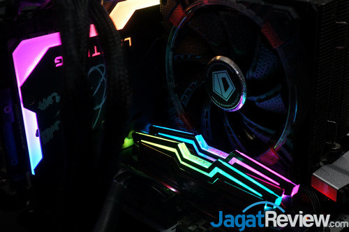 Berbicara faktor fisik, tentu ada tambahan nilai ‘bling’ dari RGB LED yang menyertainya. Tinggi modul RAM ini yang ada di 4.73cm (dari batas bawah modul ke bagian paling atas), juga masih cukup masuk akal untuk digunakan dengan berbagai pendingin CPU yang agak lebar. Sayangnya, kami melihat bahwa heatspreader yang diberikan ADATA ini nampak tidak difokuskan untuk cooling performance dan hanya menjadi penunjang penampilan, karena plat aluminium yang diberikan tidak memiliki kontak yang baik ke chip RAM. Untungnya, chip RAM DDR4 pada umumnya tidak memberikan heat output yang tinggi, sehingga hal ini mungkin masih bisa ditolerir, selama Anda tidak mencoba untuk melakukan overclocking dengan DRAM voltage / VDIMM berlebihan.