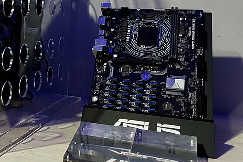 Sebuah sistem mining, dengan 20 graphics card yang terpasang ke H370 Mining Master. ASUS menggunakan custom water cooling untuk mendinginkan Core i5-8600 yang digunakan di motherboard tersebut. Sementara untuk graphics card, mereka menggunakan 12x Mining RX 470 dan 8x Mining P104. Terdapat 3 PSU yang digunakan untuk menjalankan sistem mining tersebut, yaitu dari Cooler Master, Seasonic, dan Thermaltake, masing-masing berkapasitas di atas 1000 W.