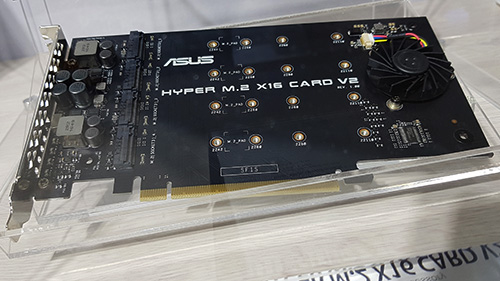 Sebuah PCIe Riser Card untuk M.2 kembali ditawarkan ASUS. Mereka memperkenalkan Hyper M.2 x16 Card V2, yang bisa menampung 4 SSD NVMe PCIe, masing-masing bisa berjalan di standar PCIe 3.0 x4. Card ini bisa menampung SSD M.2 dengan panjang hingga 110 mm, serta mendukung VROC (Virtual RAID on CPU) ketika digunakan bersama motherboard Intel Z370 atau X299.