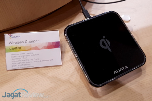 Berikutnya, ada wireless charger CW0100. Wireless charger ini mendukung standar Qi, dan mendukung pengisian ulang daya hingga 10 W (5 V, 2 A). ADATA mendesain perangkat ini agar memiliki desain yang terbilang menarik, dengan ketebalan hanya 7.5 mm, serta dilengkapi dengan proteksi terhadap overheating dan short-circuit.