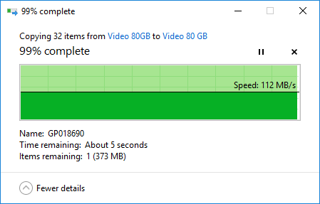 Kami mendapatkan kecepatan transfer file yang terbilang sangat stabil, di kisaran 112 MB/s untuk file besar, yang menggambarkan file Sequential. File 80 GB tersebut bisa ditransfer dari PC ke NAS dalam waktu sekitar 12 menit 16 detik. Hal ini kami rasa cukup membuktikan bahwa kemampuan dari NAS ini terbilang baik, sesuai dengan yang digambarkan oleh CrystalDiskMark. Sementara untuk file-file kecil 80 GB, kami mendapatkan catatan waktu sekitar 20 menit 50 detik, dengan kecepatan yang masih bisa dikatakan cukup stabil.
