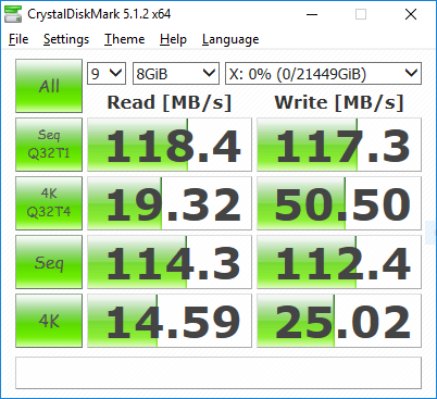 Pengujian pertama yang kami lakukan adalah dengan menggunakan CrystalDisk Mark 5.1.2. Kami menjalankan aplikasi tersebut dengan target drive di RAID 0 volume yang ada di dalam DS218+. Hasilnya bisa dilihat di bawah ini: