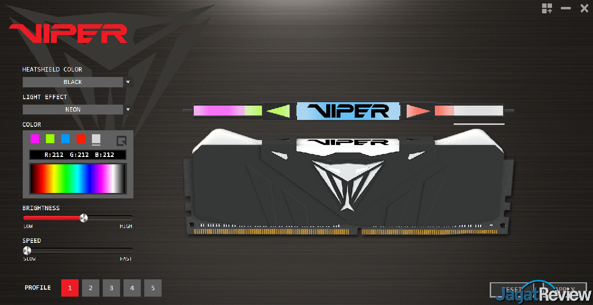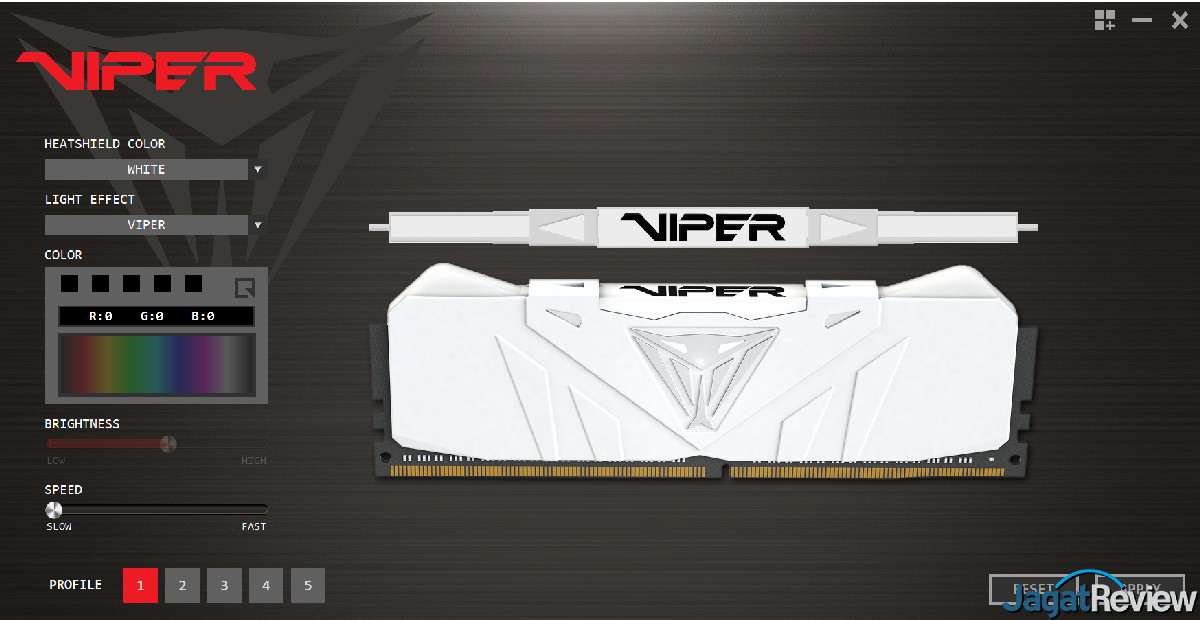 Menghadirkan fitur RGB LED lighting yang terlihat fancy tampaknya tidak akan lengkap jika tidak dilengkapi dengan software pendukung yang mumpuni. Patriot menghadirkan sebuah software yang secara khusus dibuat untuk mengatur lighting di Patriot Viper RGB. Melalui software ini, Anda akan dapat mengatur lighting effect menggunakan preset yang disediakan, mengatur secara manual per LED, kecepatan efek lighting, dan juga tingkat kecerahan LED lighting.