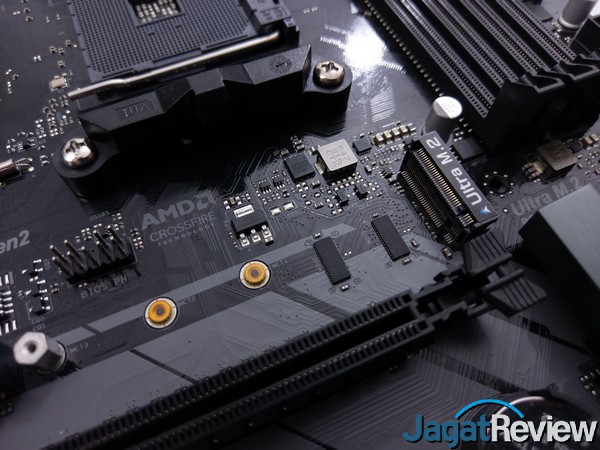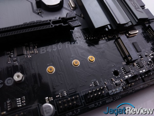 Untuk bagian storage, motherboard ini menyediakan 2 buah slot M.2 yang dapat berjalan pada konfigurasi PCIe x4 Gen3 dan sudah siap men-support NVMe SSD. Perbedaan dari kedua slot ini adalah pada slot pertama akan menggunakan bandwidth secara langsung dari CPU, dan pada slot M.2 dibawah akan menggunakan bandwidth dari chipset B450.