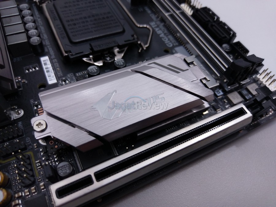 Untuk konektivitas storage, motherboard ini menyediakan 2 buah slot M.2 yang dapat berjalan pada kecepatan PCIe Gen 3.0 x4. Slot pertama M.2 ini terletak tepat di atas heatsink PCH, dan juga dilengkapi dengan sebuah heatsink.