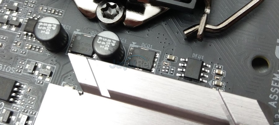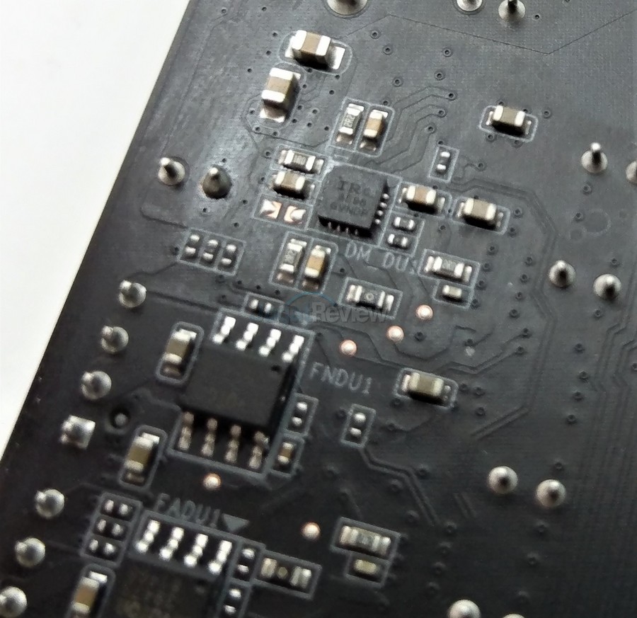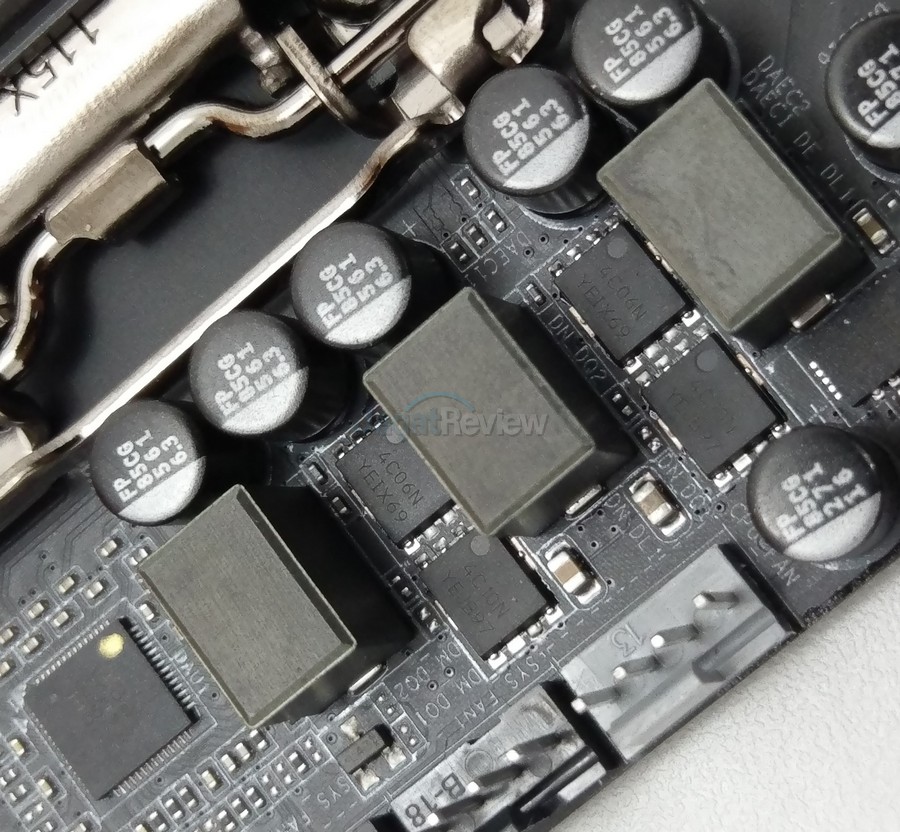 Saat kami melepas heatsink VRM motherboard ini, terlihat 5 buah IR3553M, serta 1 buah IR3553M yang terletak disamping 8-pin ATX, sehingga pada motherboard ini dari 6 mosfet hanya 5 diantaranya yang didinginkan dengan heatsink. Terdapat 1 buah mosfet dibiarkan terbuka. Konfigurasi seperti ini kami rasa sangat aneh, melihat motherboard ini masih memiliki sedikit ruang untuk meletakan heatsink. Kami sangat berharap bahwa Gigabyte Aorus mau meletakan heatsink kecil untuk 1 mosfet yang terbuka tersebut. Dengan desain 6 phase, maka motherboard ini akan dapat memberikan suplai maksimal 240A kepada CPU, dengan 1 buah IR3553M dapat memberikan suplai maksimal 40A.