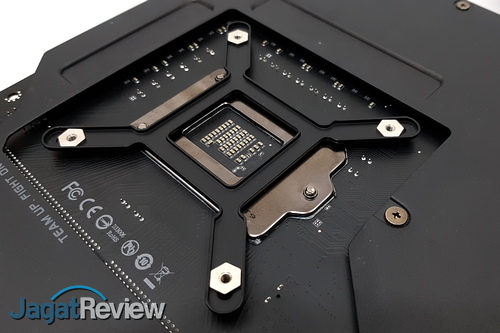 Setelah mounting bracket terpasang di waterblock, atau untuk LGA 115x/1366 sebenarnya Corsair telah memasang bracket tersebut ke waterblock, kita harus menyiapkan backplate dan standoff untuk LGA 1151. Hal yang harus dilakukan adalah menempatkan backplate sesuai posisinya di belakang motherboard. Jangan lupa, atur dulu posisi mounting di ujung kaki-kaki backplate ke posisi untuk LGA 1151.
