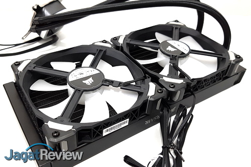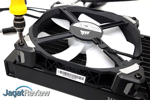 Hal yang perlu diperhatikan saat menyiapkan radiator adalah posisi kipas. Corsair merekomendasikan kipas dipasang ke radiator dengan posisi di mana kipas juga berfungsi sebagai kipas intake untuk casing. Kami mengikuti saran dari Corsair tersebut dan memasang kipas sesuai posisi yang disarankan ke radiator, yaitu dalam posisi pull, di mana kipas akan menarik udara melalui radiator. Kedua kipas kami pasang di radiatior dengan menggunakan baut yang tersedia.
