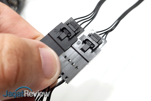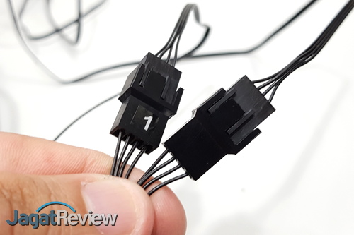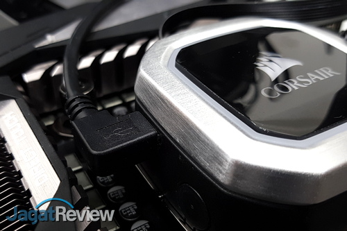 Terakhir, kita perlu menghubungkan kabel-kabel yang ada di waterblock ke tempat yang seharusnya. Kabel-kabel tersebut adalah SATA Power ke konektor SATA Power dari PSU, 3-pin ke konektor CPU FAN yang ada di motherboard, serta konektor-konektor untuk kipas ke dua kipas yang digunakan. Perhatikan, untuk kipas, agar RGB LED bekerja dengan baik, kita harus menghubungkan kabel kontrol dari kipas ke konektor yang ada di ujung kabel dari waterblock. Selain itu, kita juga harus memasang kabel “iCUE” yang tersedia di paket penjualan, dengan ujung Micro USB terpasang di waterblock dan ujung satu lagi ke header USB yang ada di motherboard.