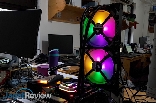 Setelah memasang Corsair Hydro Series H115i RGB Platinum ke sistem, kami sempat mencoba menyalakan sistem untuk melihat penampilan dari perangkat ini saat bekerja. Di kondisi standar, bagian atas dari unit waterblock/pump, akan menampilkan warna RGB dengan efek berjalan mengitari logo Corsair yang ada di tengah. Selain itu, di kipas, juga terlihat efek warna dari empat buah RGB LED.
