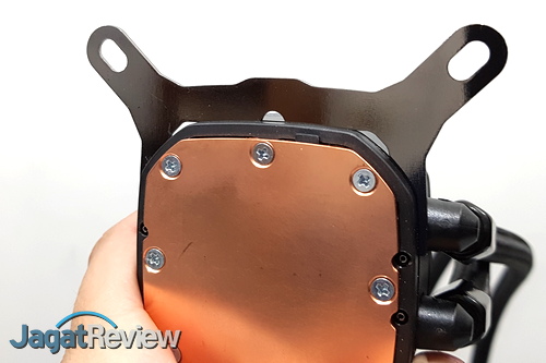 Terkait mounting bracket di Hydro Series H115i RGB Platinum ini, Corsair menggunakan desain tool less, sehingga pengguna tidak membutuhkan bantuan alat apapun untuk melepas dan memasang bracket. Hal ini mungkin akan menghemat waktu, terutama untuk pengguna yang sering memindahkan perangkat pendingin ini ke sistem dengan soket yang berbeda-beda. Untuk melepas bracket dari waterblock, kita hanya perlu menarik mounting bracket tersebut. Sementara untuk memasang, bracket hanya perlu didorong ke celah yang tersedia hingga terpasang sempurna.