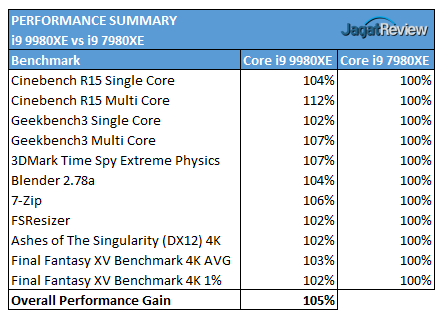 Dari berbagai pengujian yang telah kami lakukan, kami mendapatkan bahwa secara keseluruhan Intel Core i9-9980XE lebih unggul 5% dibandingkan dengan pendahulunya Core i9-7980XE. Dilihat berdasarkan tabel performance summary di atas, Intel Core i9-9980XE dapat unggul 12% untuk program yang dapat memanfaatkan seluruh 18 core. keunggulan maksimal 12% ini berkat peningkatan 400MHz base CPU clock speed dari Intel Core i9-7980XE. Angka 12% tersebut cukup masuk akal mengingat bahwa peningkatan 400MHz untuk base clock speed tersebut merupakan peningkatan 12% dari CPU base clock speed Core i9-7980XE.