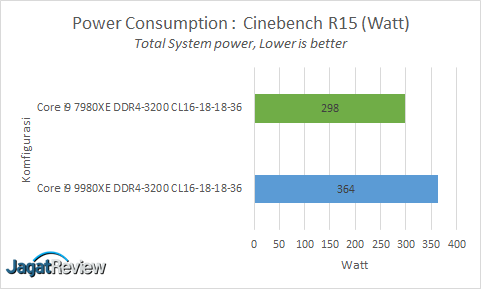 Kemudian, setelah melihat peningkatan performa dari Core i9-9980XE dibandingkan dengan Core i9-7980XE, kali ini kami melihat dari sisi konsumsi daya. Berdasarkan data konsumsi daya yang kami dapatkan, Intel Core i9-9980XE memiliki konsumsi daya 22% lebih tinggi dari Core i9-7980XE pada saat menjalankan Cinebench R15. Dengan konsumsi daya 22% lebih tinggi dari Core i9-7980XE performa yang didapatkan oleh Core i9 9980XE ini lebih tinggi 12%.