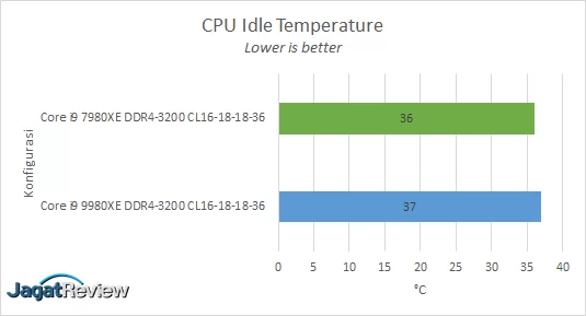 Pengujian yang kami lakukan tentunya tidak akan terasa lengkap tanpa adanya uji konsumsi daya dan suhu. Untuk suhu sendiri, hal ini merupakan yang cukup ditunggu-tunggu karena Intel Core i9-9980XE menggunakan STIM yang akan melawan Intel Core i9-7980XE yang menggunakan paste base TIM. Kami melakukan pengujian ini di skenario idle dan load Cinebench R15 Multi Core.