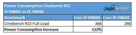 Sehingga untuk mendapatkan 12% performa ekstra Core i9-9980XE, prosesor ini membutuhkan daya 22% ekstra pada saat dibandingkan Core i9-7980XE.
