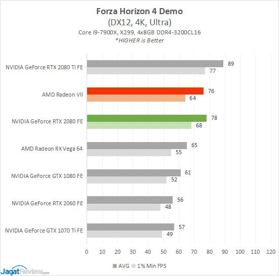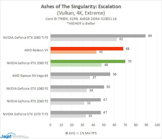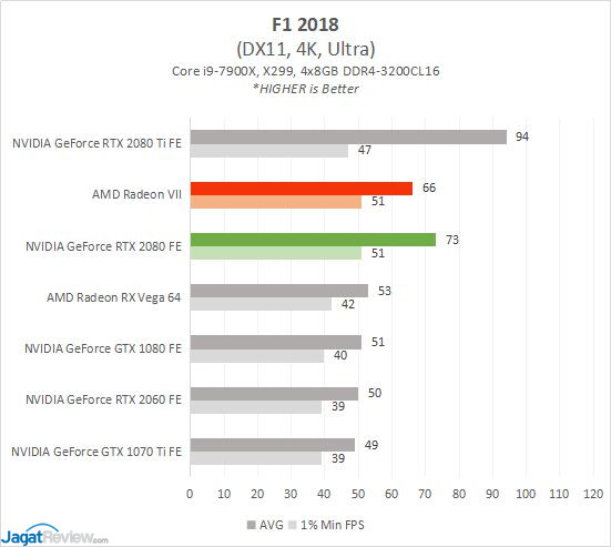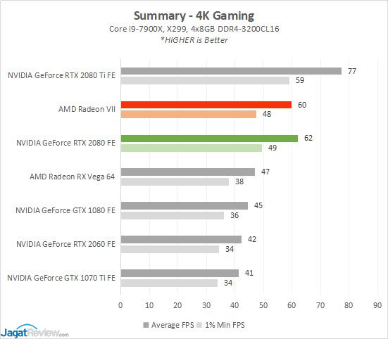 Dari segi performa gaming di 4K, nampak bahwa Radeon VII sejauh ini sesuai dengan ekspektasi AMD dimana ia mendekati GeForce RTX 2080, dan meninggalkan generasi lama-nya (RX Vega 64) lebih dari 25%.