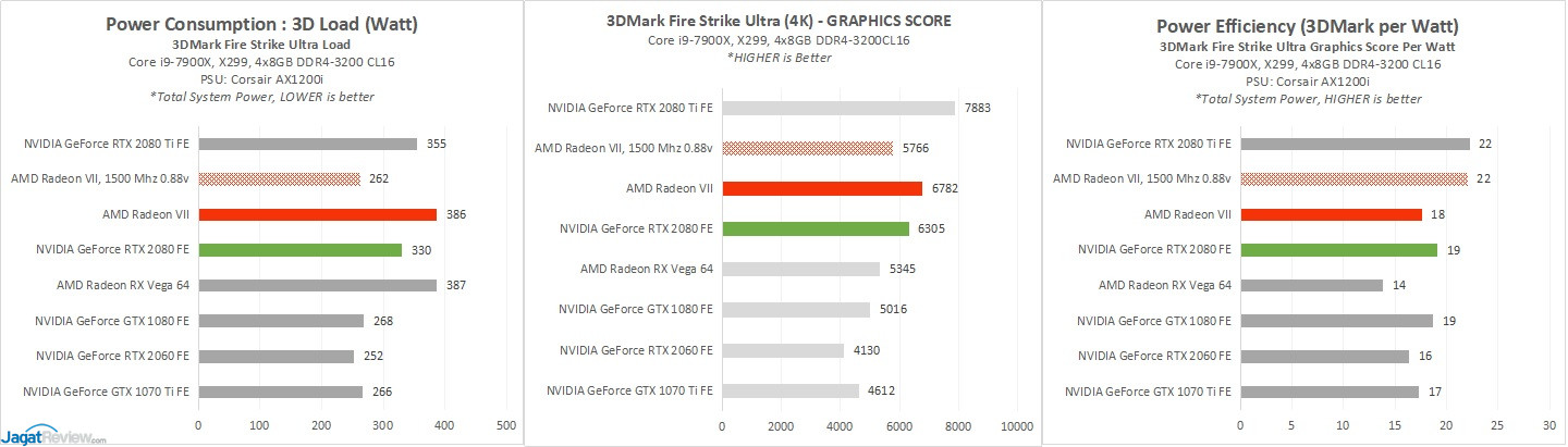 Efisiensi Daya Radeon VII meningkat begitu beroperasi pada clockspeed lebih rendah, 1600Mhz 0.94v1500 Mhz 0.88v (defaultnya 1800Mhz 1.05 – 1.08v).