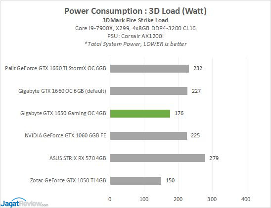 Melihat desain GPU GTX 1650 yang nampak diciptakan untuk GPU hemat daya, konsumsi daya-nya jelas bersahabat. Yang agak disayangkan disini adalah performance per watt-nya tidak terlalu spesial, bahkan GTX 1060 FE masih punya efisiensi daya yang lebih baik.